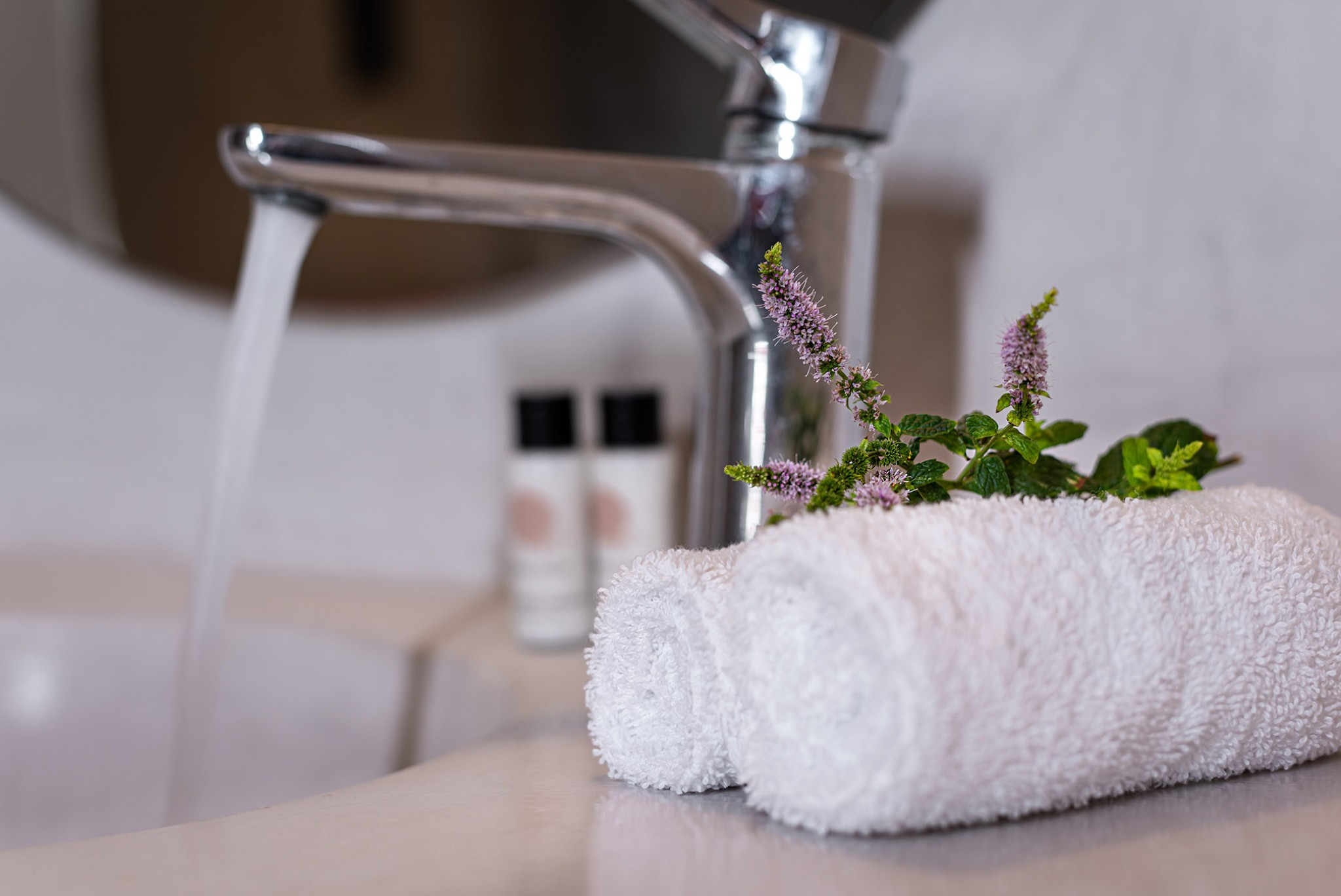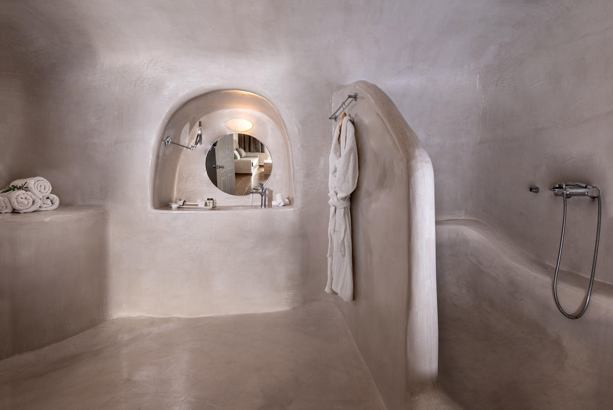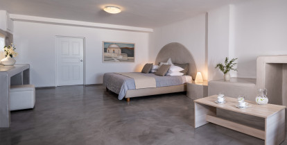 When stepping into our Standard Room, you will immediately feel the soothing ambiance born from the calming shades and the Cycladic style that rules the spirit. Cooperating with a sleek cave-like bathroom, the spacious interiors with the comfy double bed (or twin beds) in tones of gray are made for serenity.